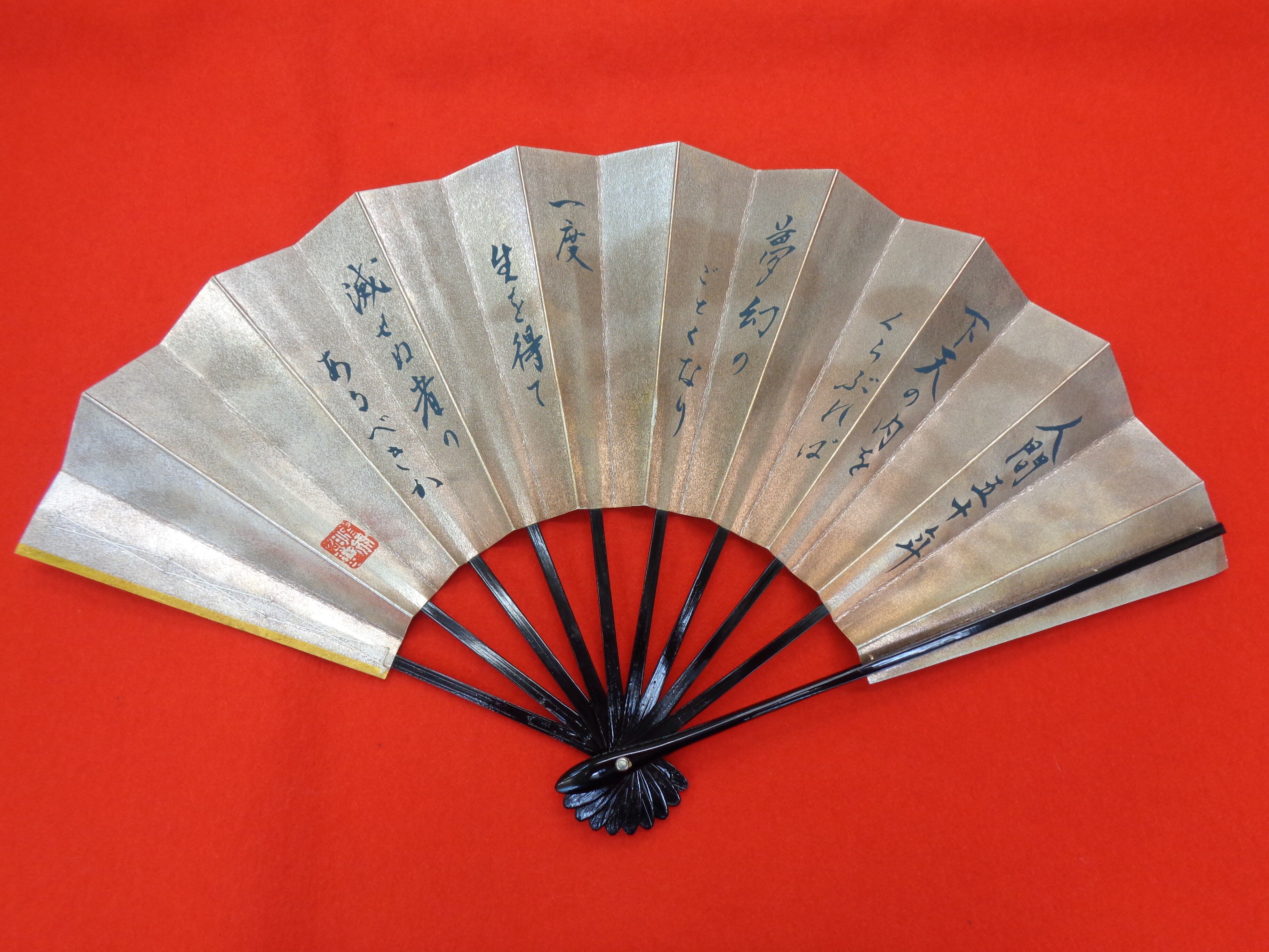 表に「安土城」、裏に幸若舞の演目「敦盛」の一節”人間五十年 下天の内をくらぶれば 夢幻のごとくなり”が記されています。